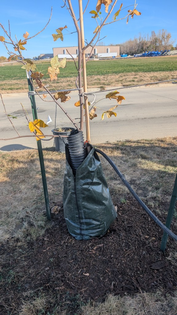 Watering: Providing enough water for young trees is the most important thing you can do to for long-term health (following proper planting techniques of course). The frequency and amount of watering varies based on area rainfall, moisture-holding capacity of the soil, and site drainage characteristics. A good general rule is that newly transplanted trees need an equivalent inch of rain or supplemental water every week to 10 days. That equates to roughly five to ten gallons of water for newly planted trees if you are not getting any rainfall. It is still beneficial in the late season to water trees all the way up until the ground freezes and no longer absorbs water readily. However, make sure to remove any watering buckets or gator bags from the tree so they do not freeze in place over winter. Once the ground is thawed and absorbing moisture in spring, watering can resume normally.